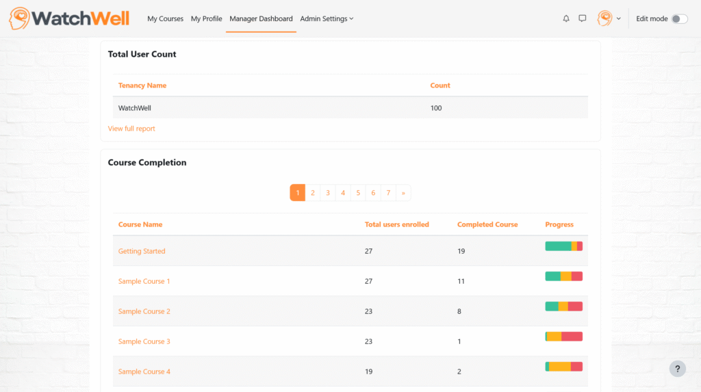 Supervisors can view training progress through a reporting dashboard. This gives an at-a-glance view of completions, activity and engagement across their team. As more modules and learners are added, this view helps track who has completed their required training.
