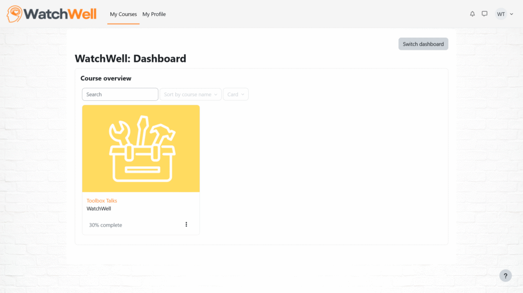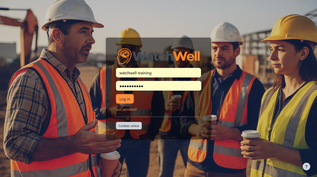 This page provides an overview of how workers and supervisors interact with the WatchWell Toolbox Talks training inside our learning environment. The screenshots below highlight the core experience from login through to reporting, giving a clear sense of how the content is delivered and how progress can be viewed.