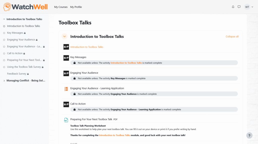Inside the Toolbox Talks course, modules are organised in a straightforward sequence.